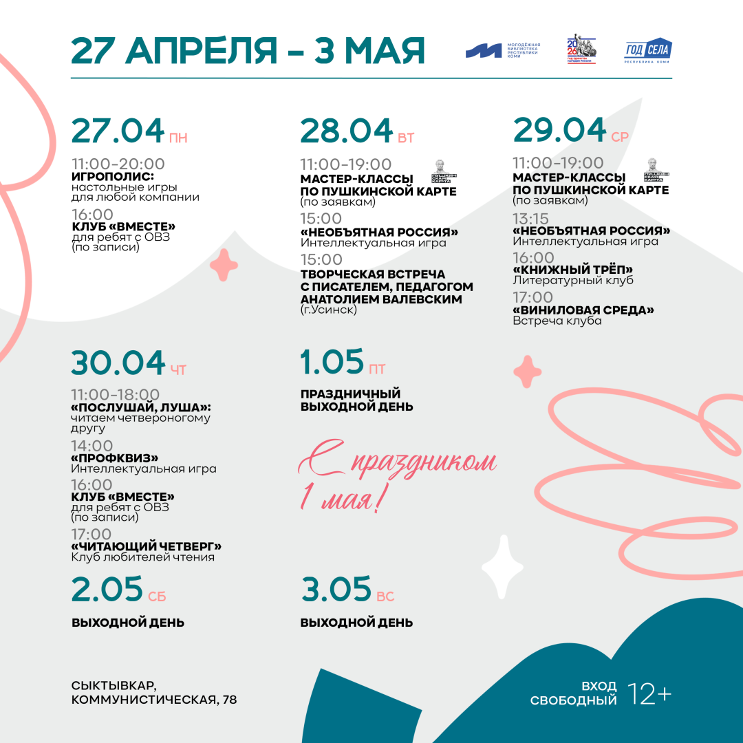 С 27 апреля вас ждут: творческая встреча с писателем, педагогом Анатолием Валевским; чтение хороших книг вслух Луше и в клубе «Читающий четверг»; встречи любителей винила и фантастики; мастер-классы по Пушкинской карте, полезные занятия в клубе «Вместе», интеллектуальные и настольные игры.