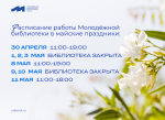 Обратите внимание: 30 апреля библиотека работает с 11:00 до 19:00. 1, 2, 3 мая в библиотеке – праздничные и выходные дни.