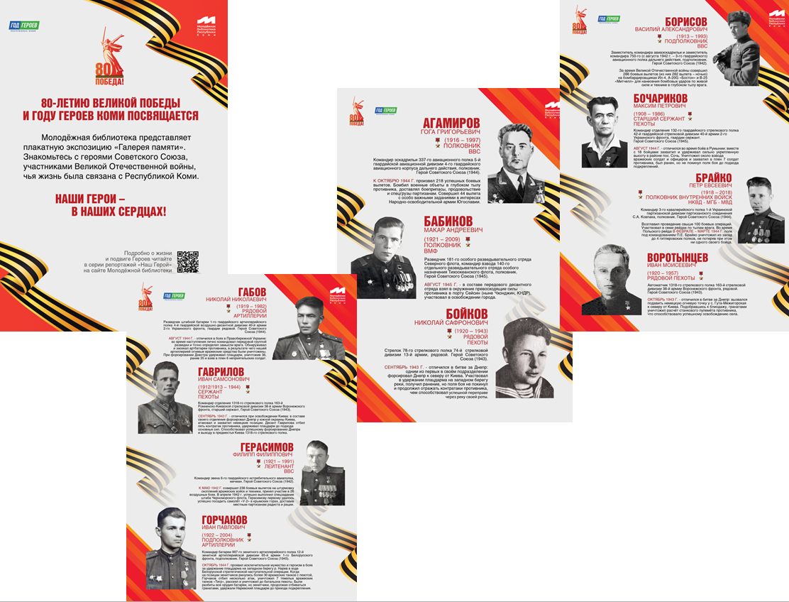 В апреле 2025 г. в окнах Молодёжной библиотеки открылась плакатная выставка «Галерея памяти», знакомящая с подвигом Героев Советского Союза, которыми гордится Республика Коми. Презентация плакатной экспозиции состоялась в преддверии Дня Победы с приглашением учащейся молодёжи, членов Сыктывкарского Совета ветеранов, детей войны.