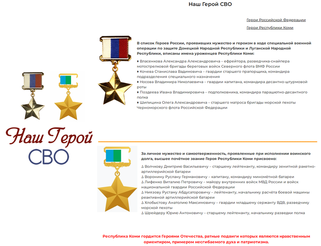 Совершенствовался ещё один виртуальный проект МБРК – «Наш Герой СВО», посвящённый Героям Российской Федерации и Героям Республики Коми, уроженцам республики – участникам специальной военной операции. В список героев были включены новые имена: Героя Российской Федерации С.В. Кочина, Героев Республики Коми Д.В. Волчкова, Р.Г. Воронина, Ю.А. Шрейдера.