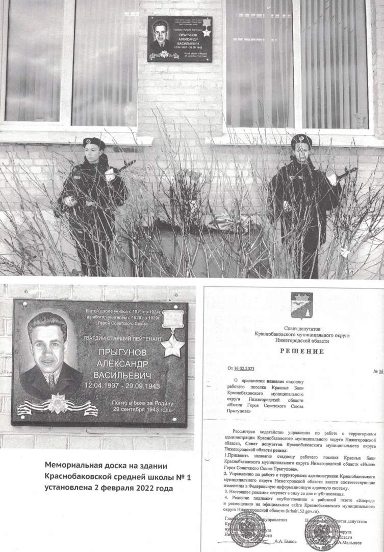 Инициативу Совета клуба одобрил депутат Законодательного собрания Нижегородской области С. В. Борякин. 2 февраля 2022 года на территории Краснобаковской средней школы N° 1 состоялся торжественный митинг и открытие мемориальной доски в память о Герое Советского Союза Прыгунове Александре Васильевиче. Администрация Краснобаковского района поддержала обращение Совета патриотического клуба «Память» об изготовлении и установке мемориальной плиты А.В. Прыгунову на площади Свободы. В День памяти и скорби, 22 июня 2022 года, в центре Красных Баков состоялся митинг и открытие установленной памятной плиты Прыгунову на мемориале жителям рабочего поселка, погибшим при защите Отечества в годы Великой Отечественной войны. Совет клуба обратился в администрацию Краснобаковского муниципального округа с просьбой о присвоении поселковому стадиону имени Героя Советского Союза Прыгунова. Было принято решение Совета депутатов от 16 февраля 2023 года «О присвоении названия стадиону рабочего поселка Красные Баки имени Героя Советского Союза Прыгунова».