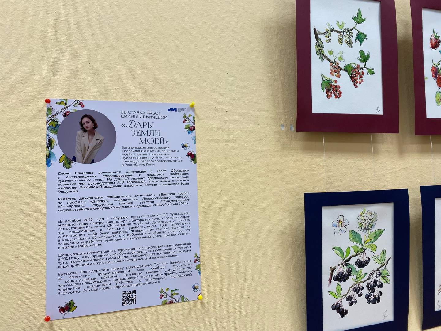 На выставке «Дары земли моей» представлены ботанические иллюстрации юной художницы для новой книги. Яркие и живые работы с узнаваемыми растениями выполнены в акварельной технике с добавлением чёрного лайнера. «Шанс создать иллюстрации к переизданию уникальной книги, изданной в 2001 году, я воспринимаю как большую удачу на моём художественном пути. Творческий поиск в этой области вдохновил меня настроиться на один лад с природой» – призналась на открытии Диана.