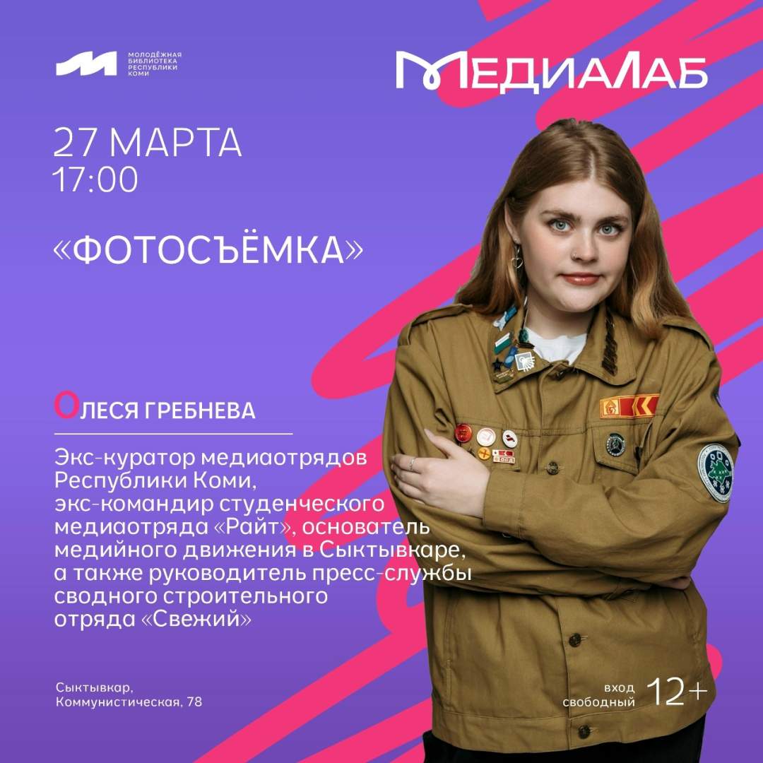 Друзья, на сегодняшней встрече клуба «МедиаЛаб» о секретах мобильной фотографии вам расскажет Олеся Гребнева, экс-куратор медиаотрядов Республики Коми, экс-командир студенческого медиаотряда «Райт», основатель медийного движения в Сыктывкаре, а также руководитель пресс-службы сводного строительного отряда «Свежий».